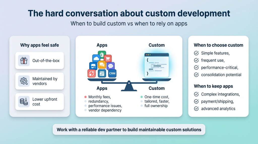 We’re not saying everything should be custom. Use apps for complex functionality that would be expensive to rebuild—advanced analytics, sophisticated email marketing platforms, payment processors, shipping integrations. That’s what apps are great for.