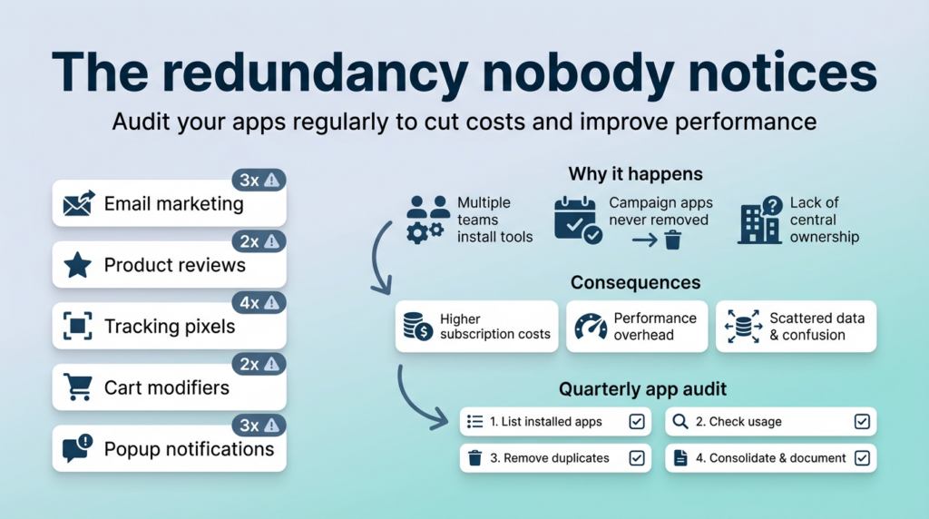 We see this constantly. Stores running 25, 30, sometimes 40+ apps. Some are critical. Some are redundant. Some haven’t been used in a year but nobody’s sure if they can be safely removed. And the whole thing has become a fragile ecosystem where touching anything might collapse something else.
